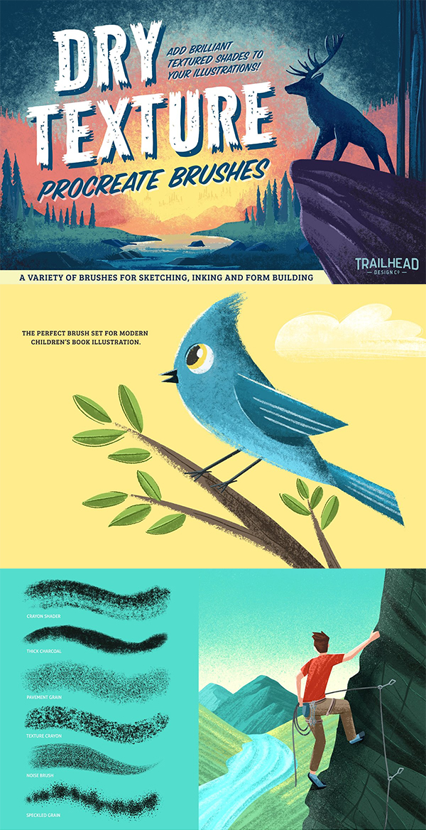 Get the most out of your outdoor, coffee shop or on-the-bus sessions. This collection of dry brushes for Procreate offers a nice set of natural-feel tools to help you capture your ideas in quick sketches and also take them to a finished painting, all in one pack!